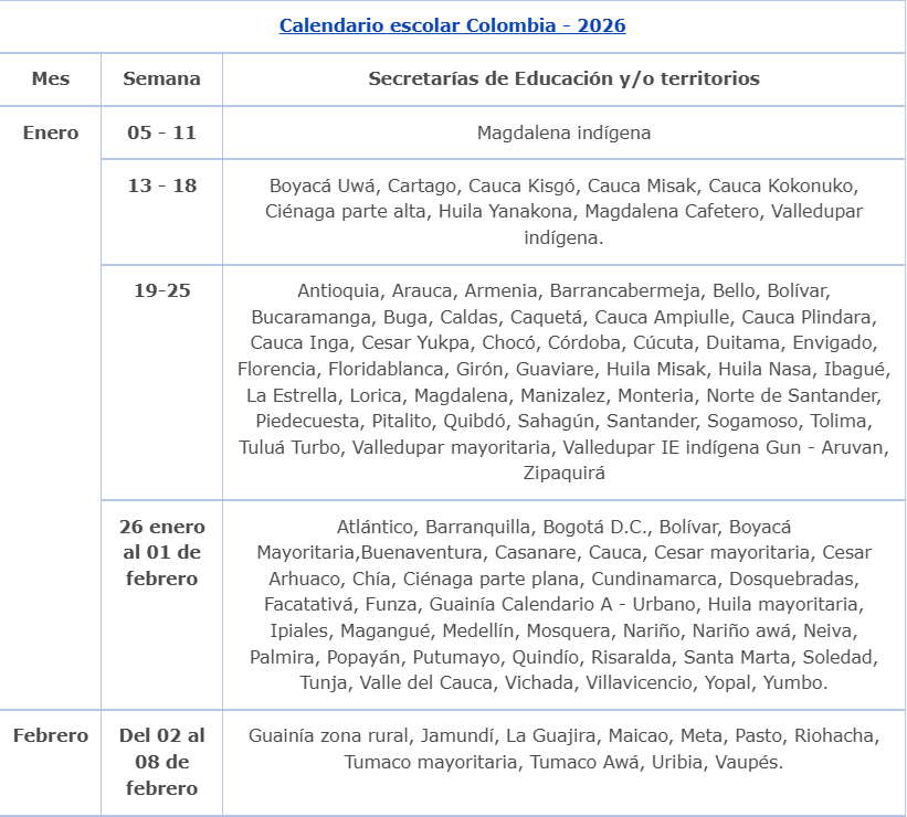 En este contexto, el Ministerio de Educación Nacional de acuerdo con las resoluciones emitidas por cada ETC comparte con la comunidad educativa cómo se distribuye el inicio del calendario escolar en los territorios del país. Entre el 5 de enero y el 2 de febrero de 2026, las secretarías de educación inician las actividades académicas, de la siguiente manera: