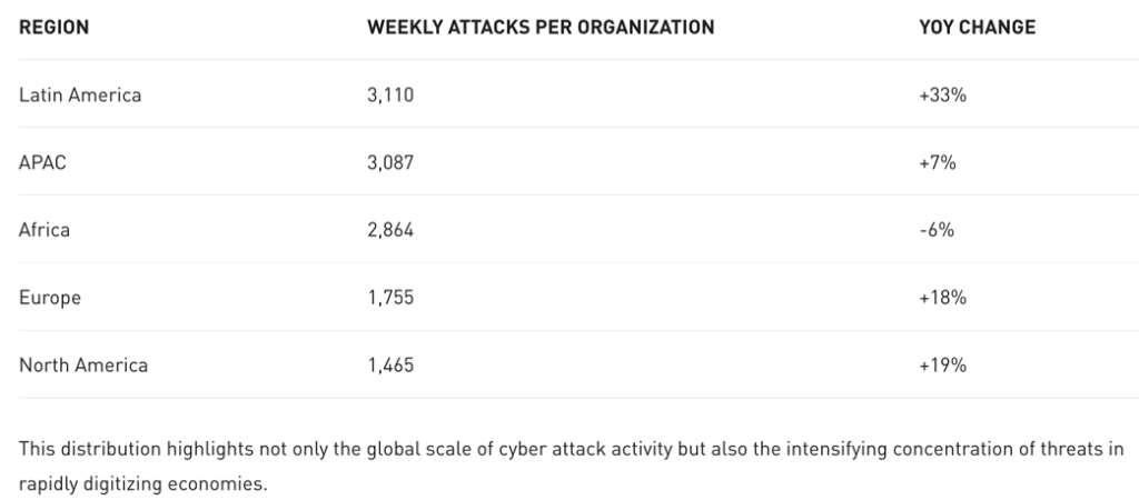 Por regiones, Latinoamérica registró el mayor volumen de ataques, con un promedio de 3.110 ataques por organización por semana (+33% interanual). Le siguió APAC con 3.087 ataques (+7% interanual), África registró 2.864 (−6% interanual), Europa aumentó un 18% y América del Norte creció un 19% interanual.