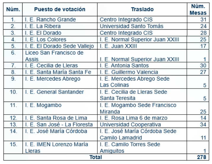 A continuación, se detallan los puestos de votación que se trasladarán, así como el número de mesas de cada uno: