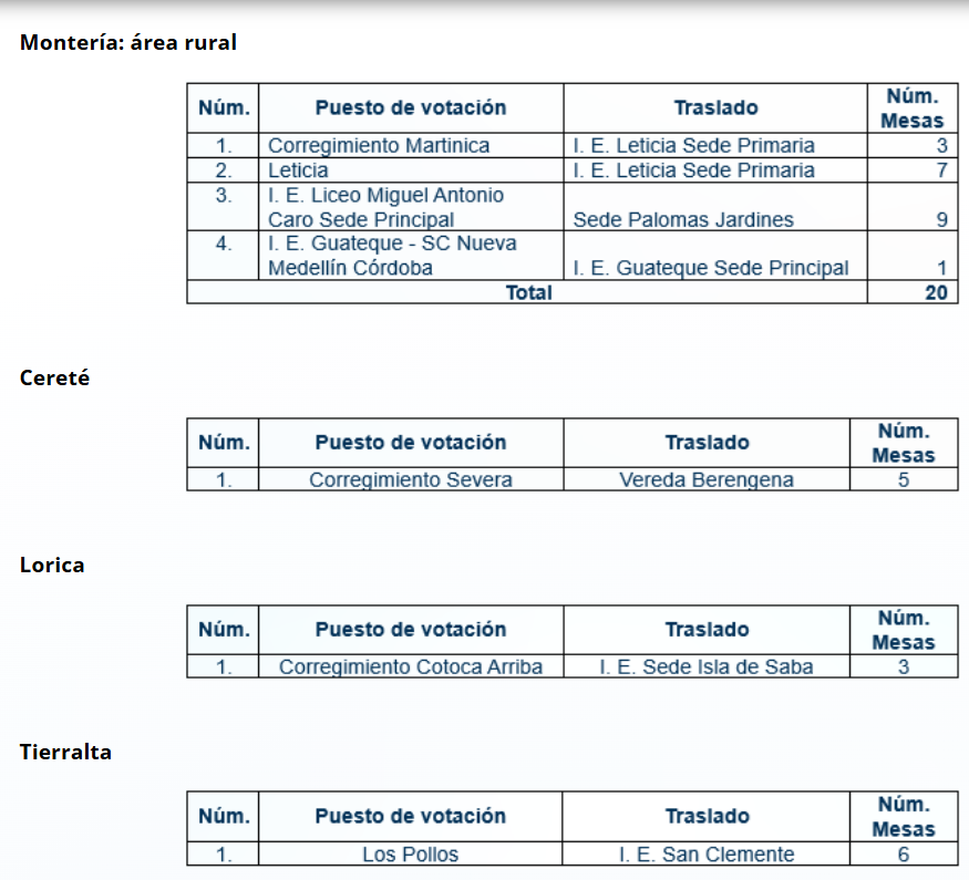 En Montería, se trasladarán 19 puestos de votación: 15 en el área urbana y 4 en el área rural. En los demás municipios se realizará el traslado de un puesto de votación.