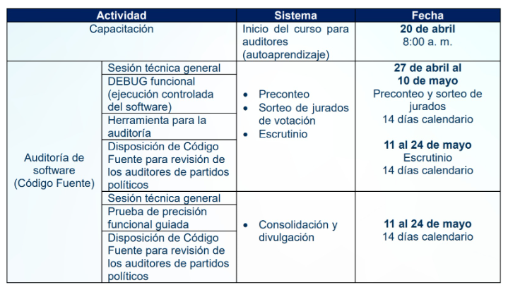 De igual manera, como una de las principales medidas de transparencia, el plan comprende la auditoría del Código Fuente de los softwares de sorteo de jurados de votación, preconteo, escrutinio y consolidación y divulgación de resultados por los auditores de los partidos políticos acreditados.