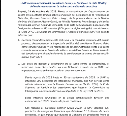 Frente al comunicado del Departamento del Tesoro de los Estados Unidos sobre la inclusión del presidente de la República de Colombia, Gustavo Francisco Petro Urrego, de la primera dama de la Nación, Verónica del Socorro Alcocer García, de Nicolás Fernando Petro Burgos y del señor ministro del Interior, Armando Benedetti, en la Lista de Ciudadanos Especialmente Designados y Personas Bloqueadas (SDN, por sus siglas en inglés), conocida como la “Lista OFAC”, la Unidad de Información y Análisis Financiero (UIAF) se permite informar que: